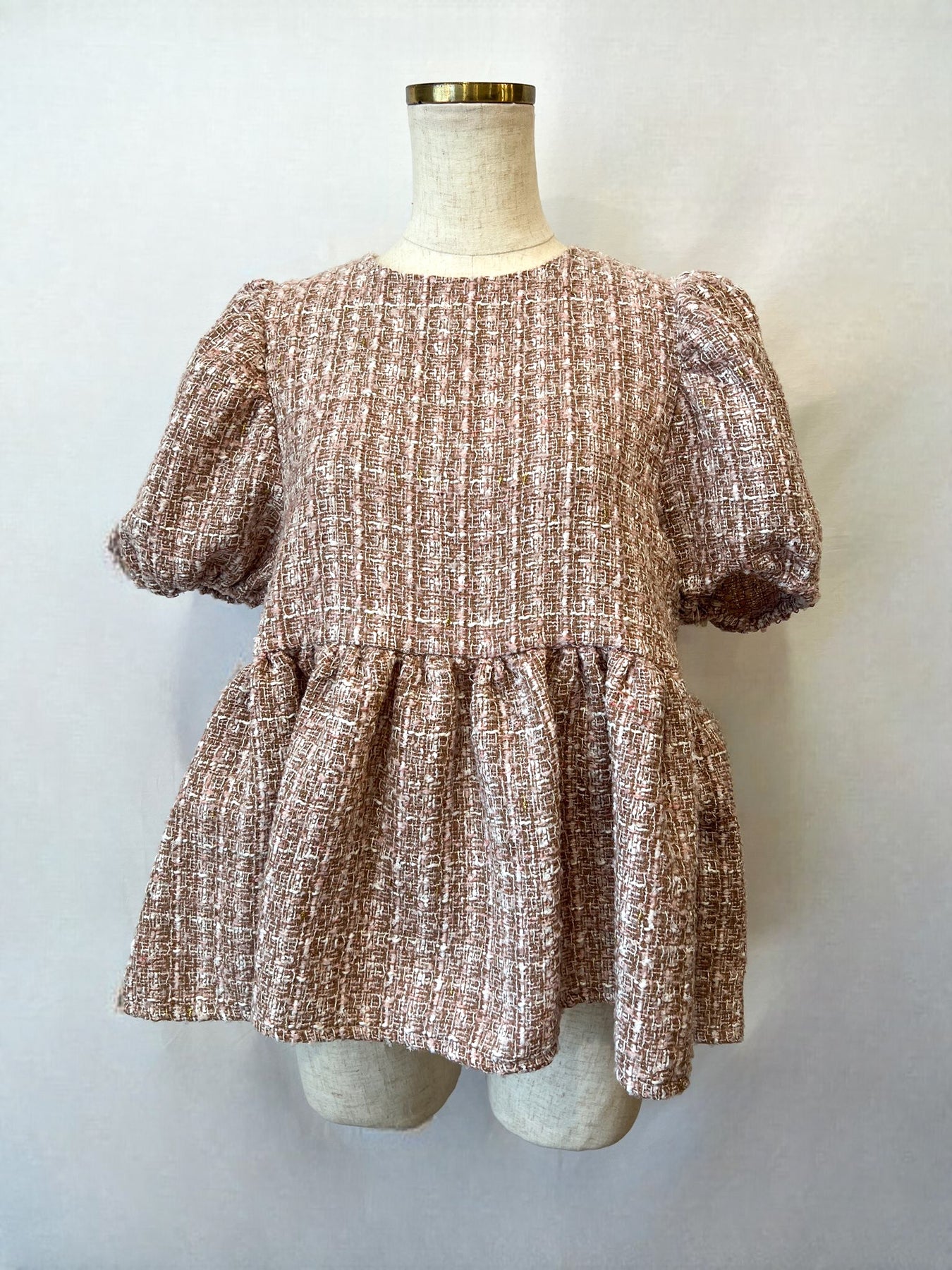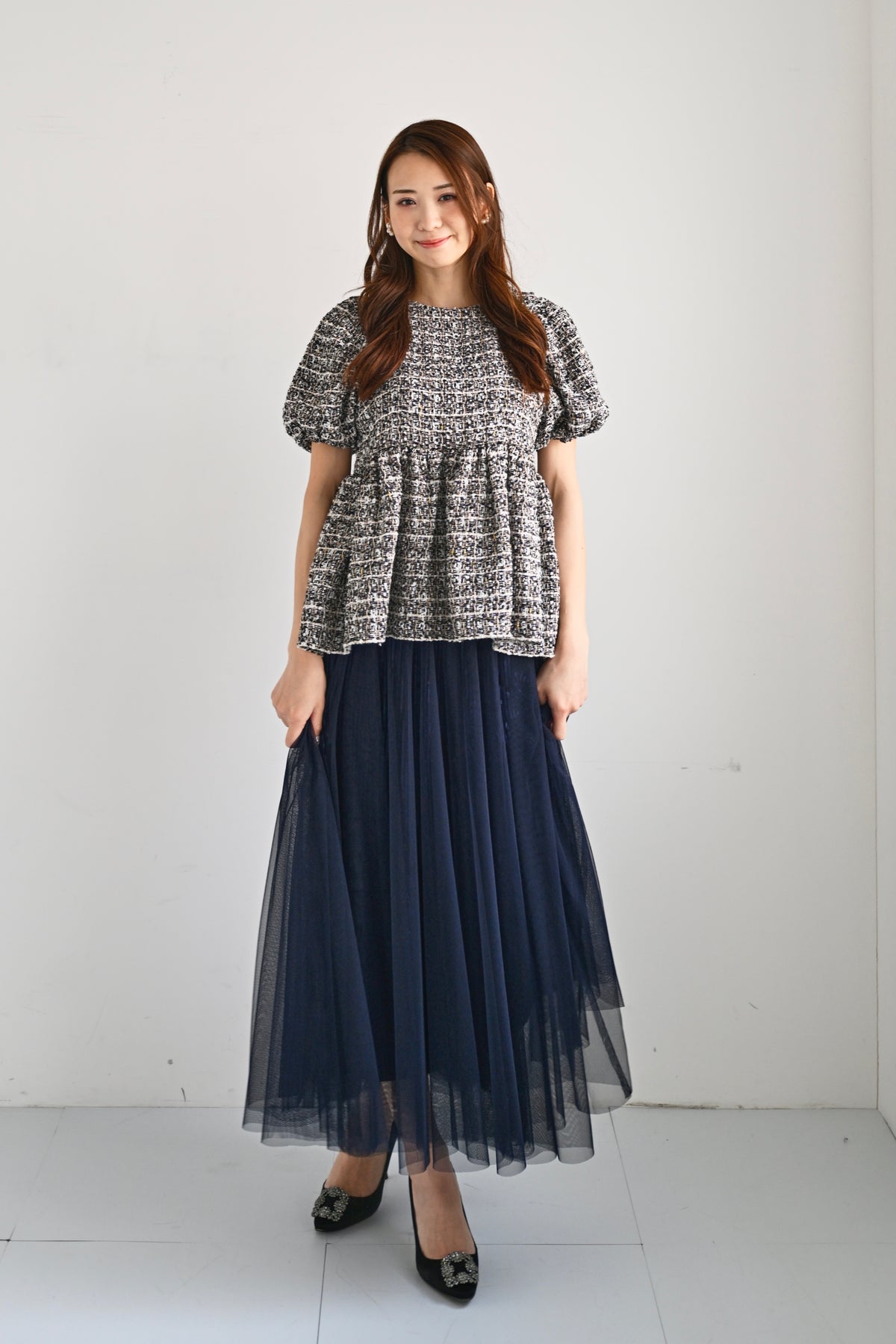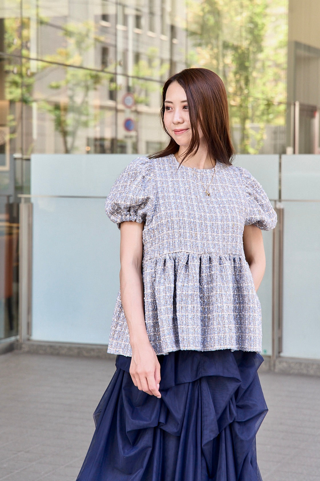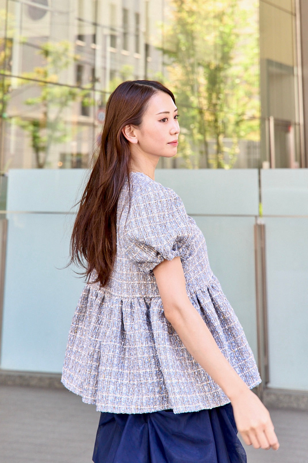 モデルが着用した正面スタイルのツイードペプラムトップス