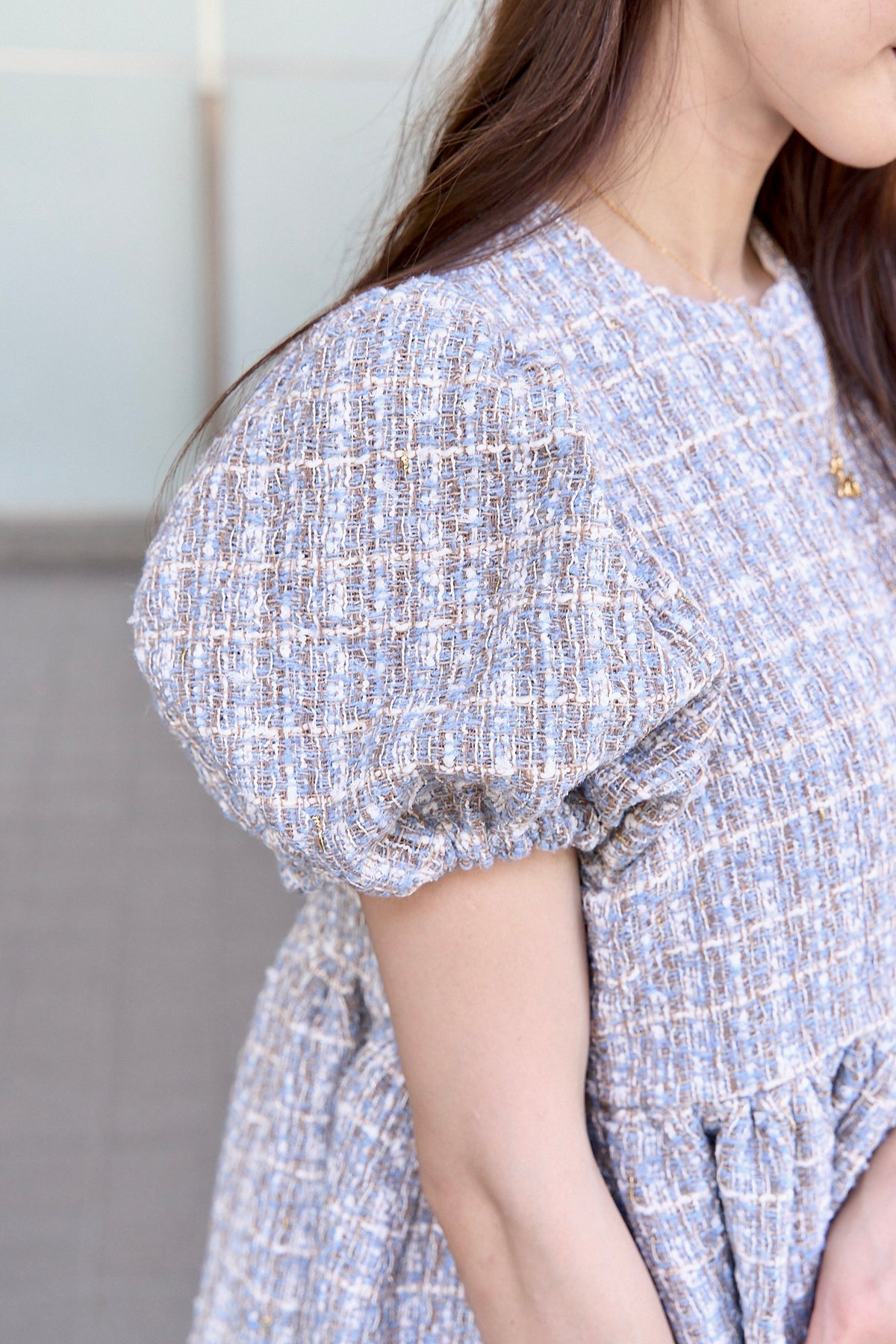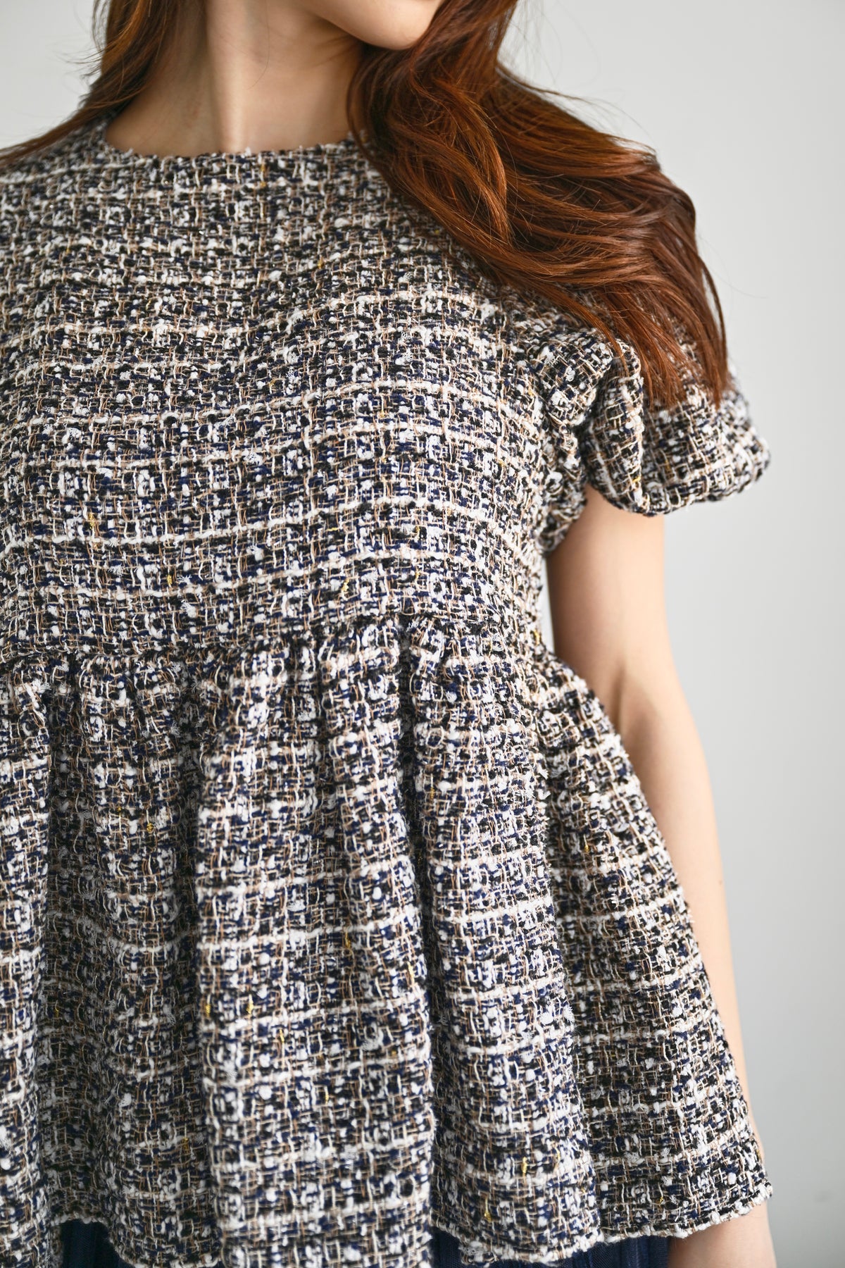 モデルが着用した正面スタイルのツイードペプラムトップス(生地ディテール)