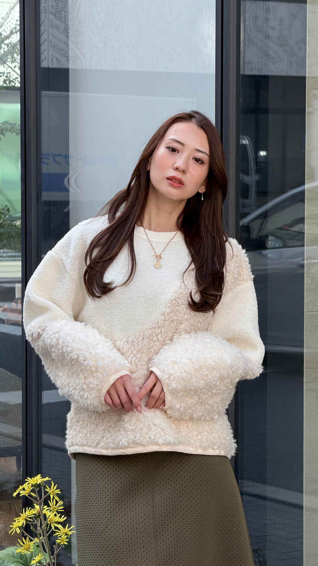ふんわりとしたボア素材と、配色の切り替えが印象的♩