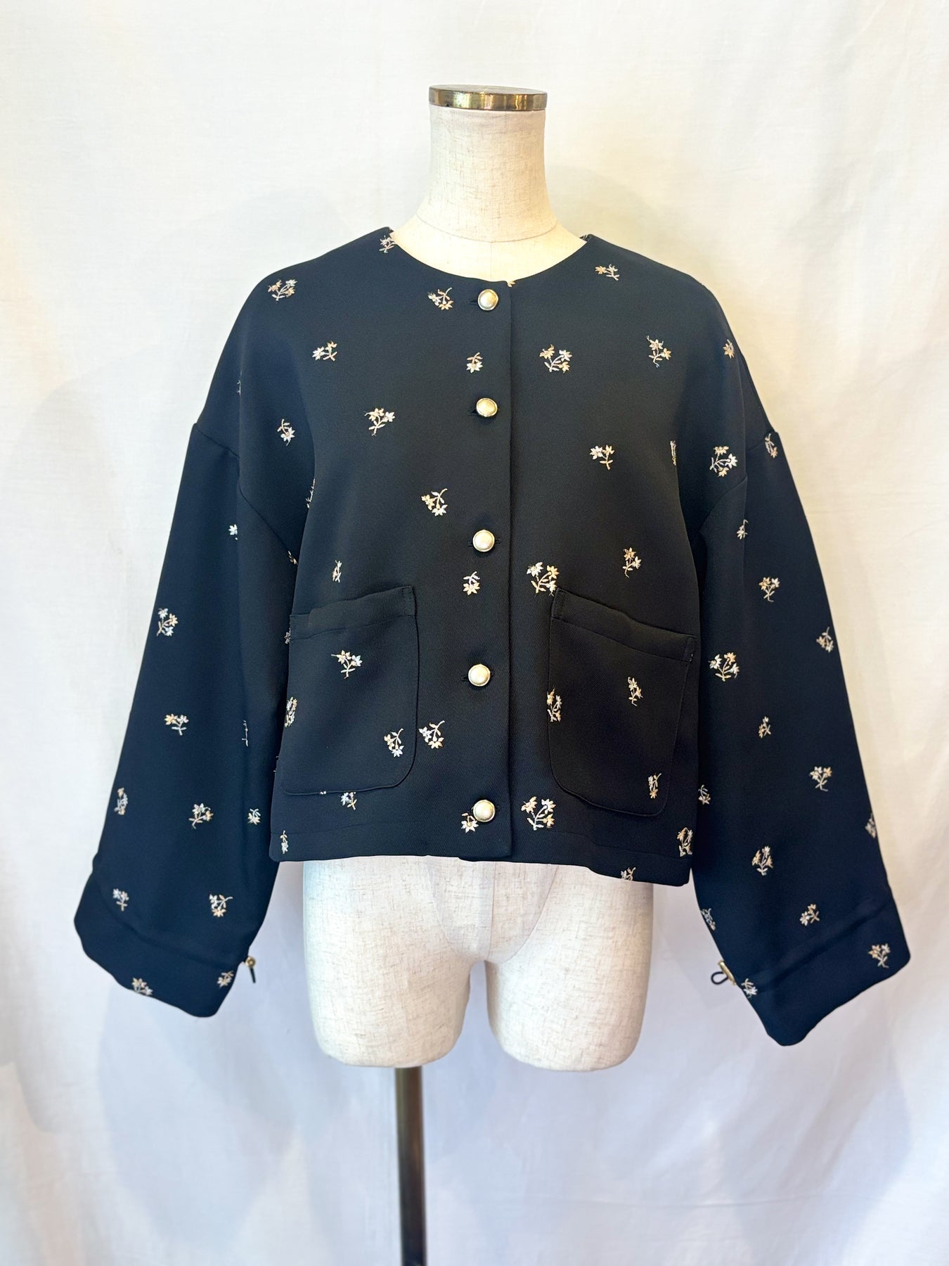 総裏地で着心地◎ フェミニンもカジュアルも楽しめる万能アイテムです♡ ブラック地にキラッと光るラメ糸の花柄刺繍が映えるジャケット♡