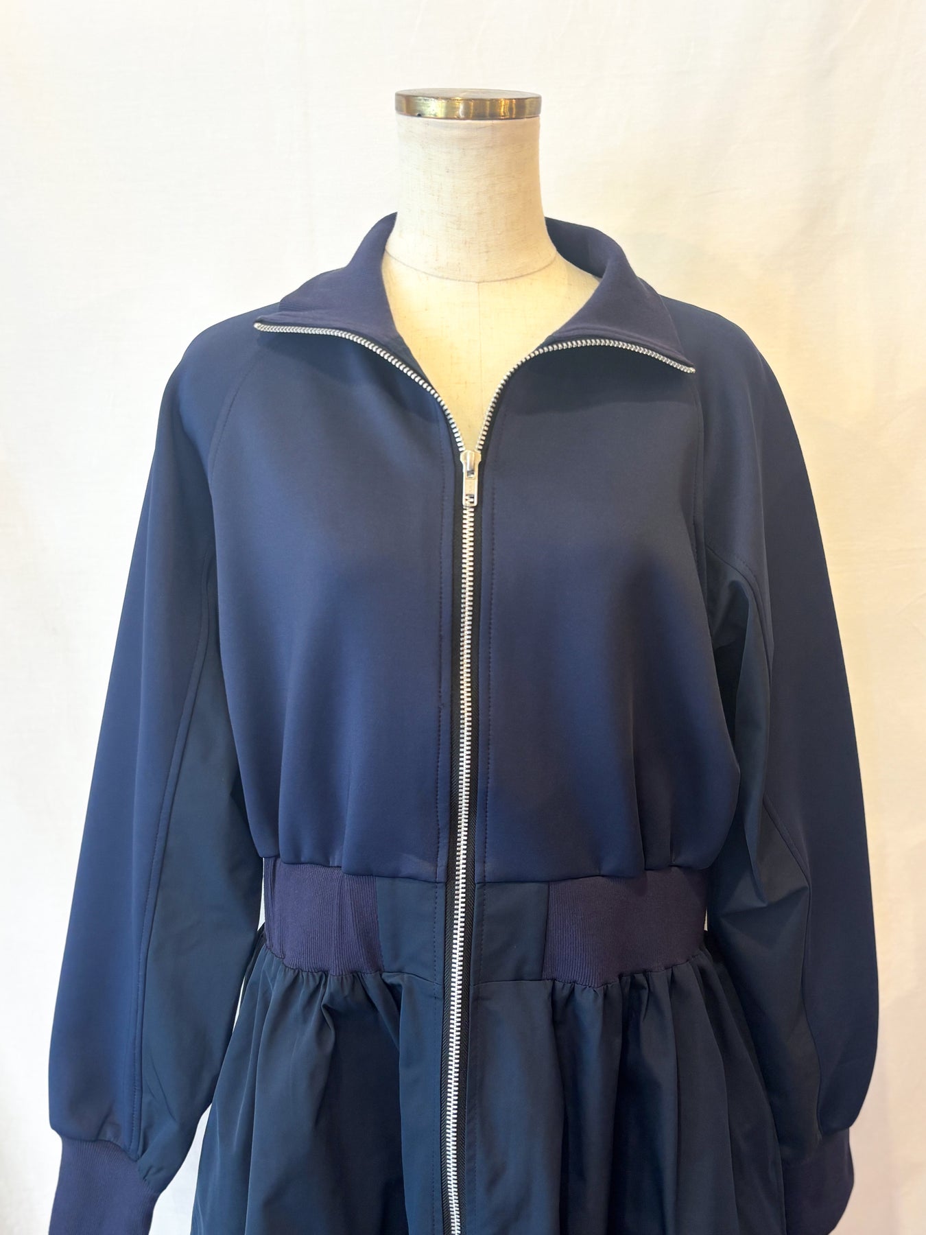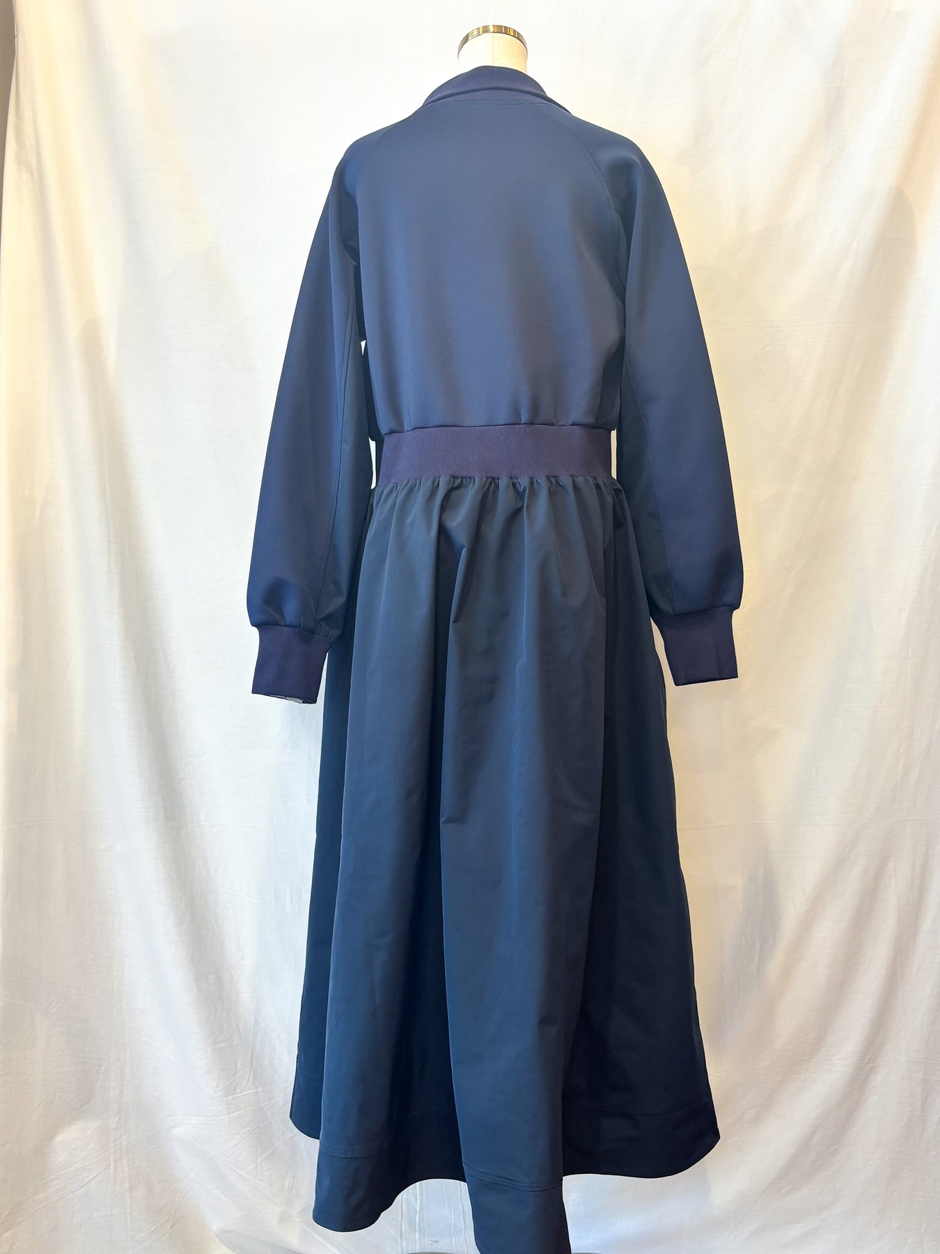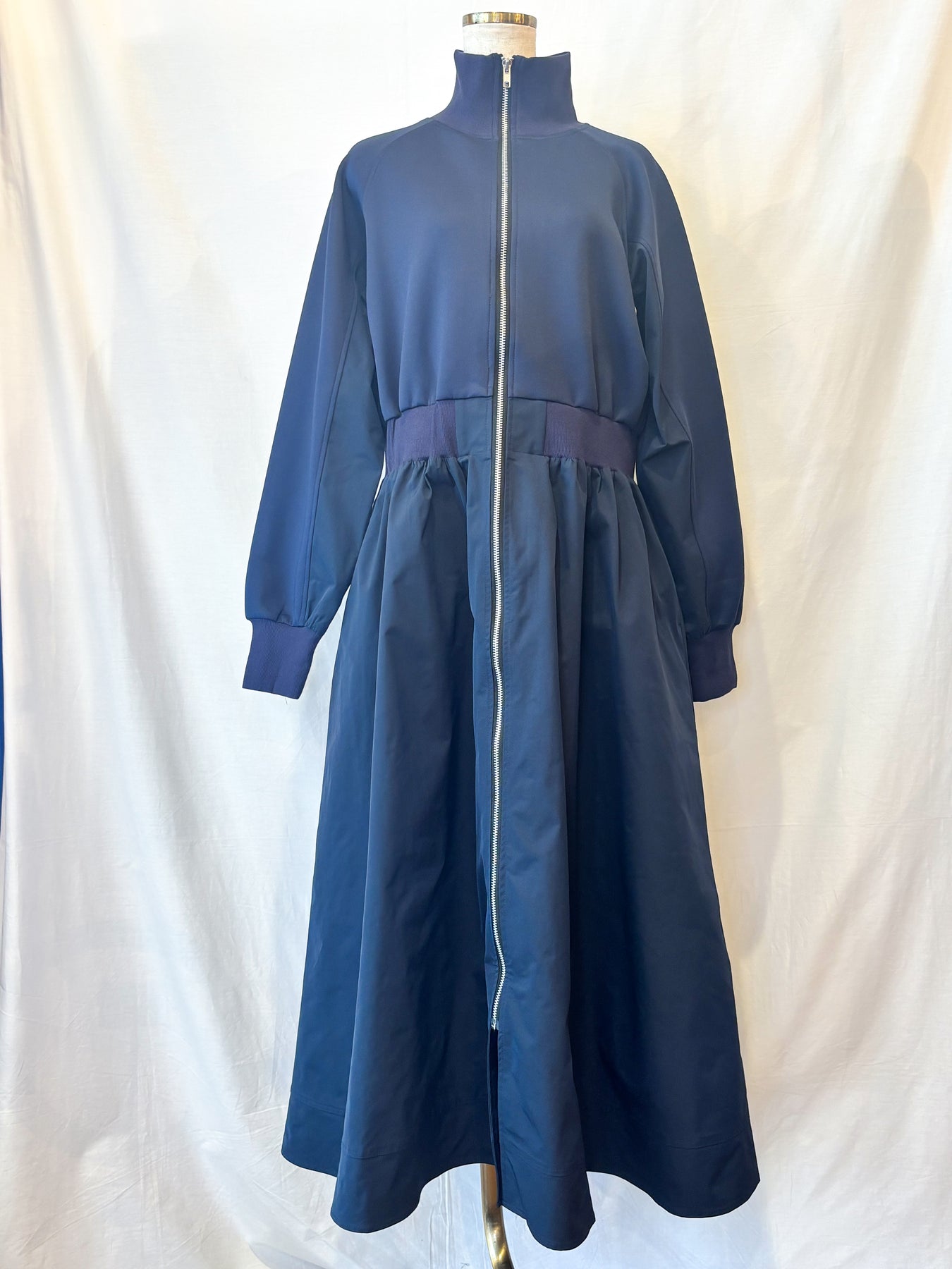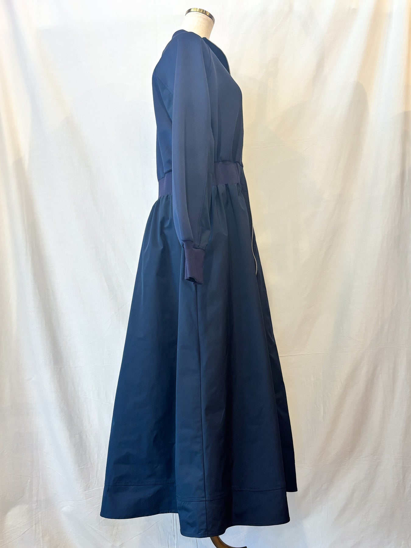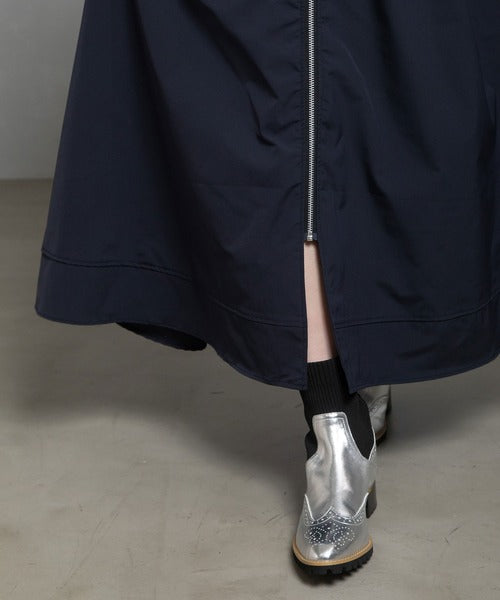前を閉じれば端正なワンピースに、ジップを開ければ軽やかなロングアウターとして、シーンに合わせて自在に表情を変える一枚です。