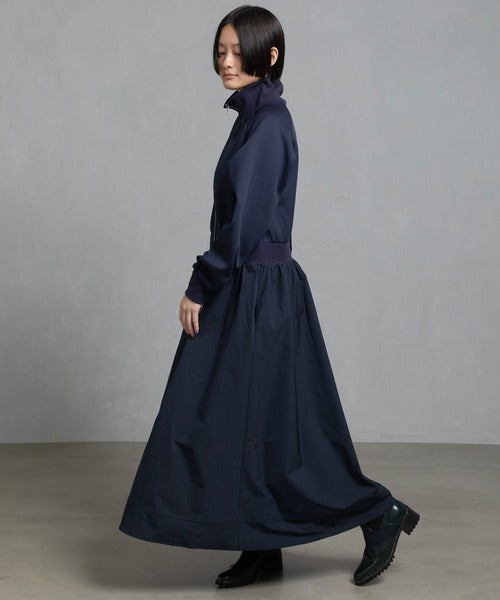 スカート部分のボリュームのあるフレアーラインにウエストをリブで切替え、メリハリをつけたシルエットに。