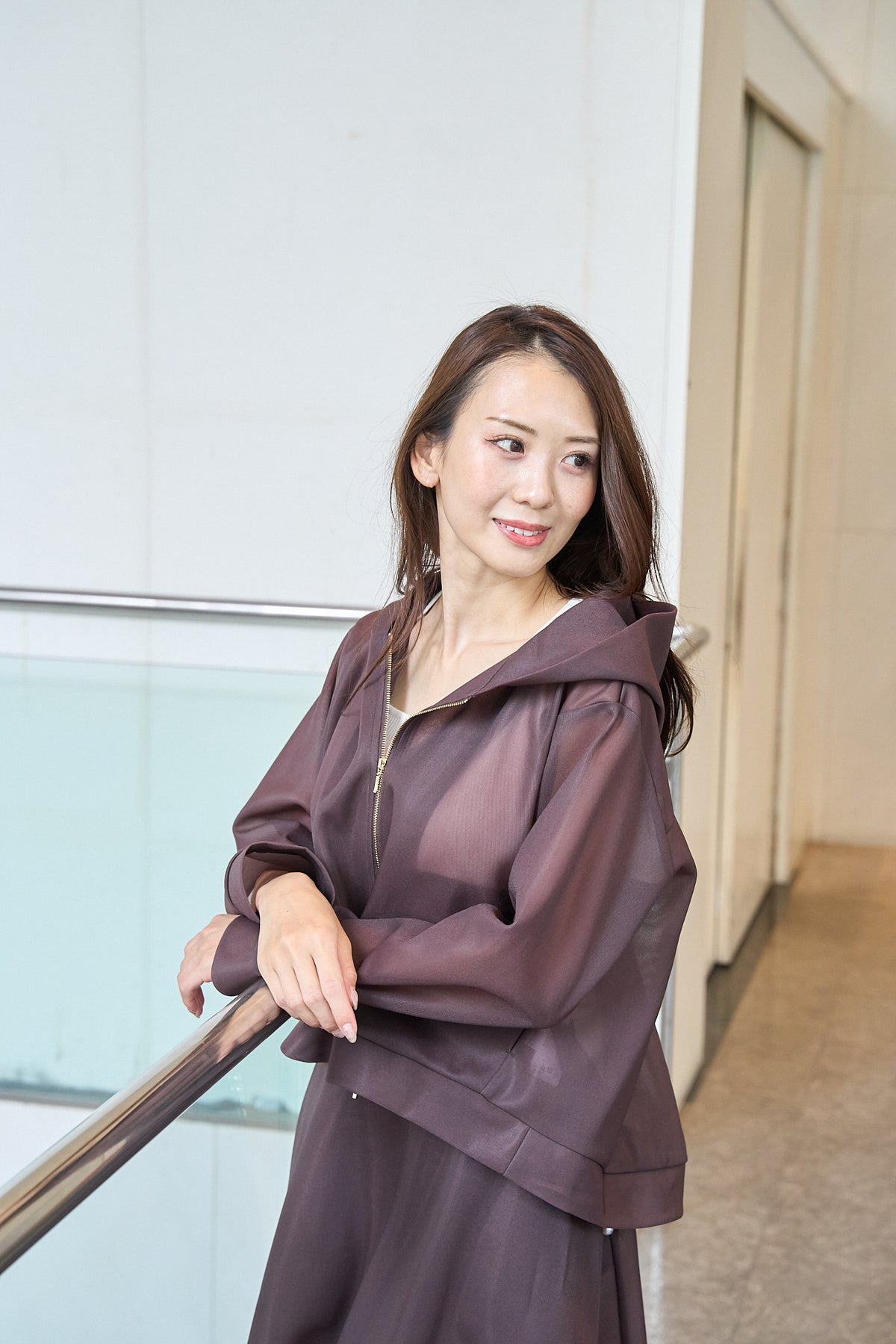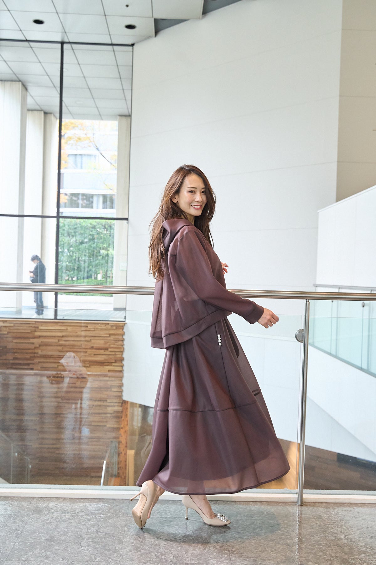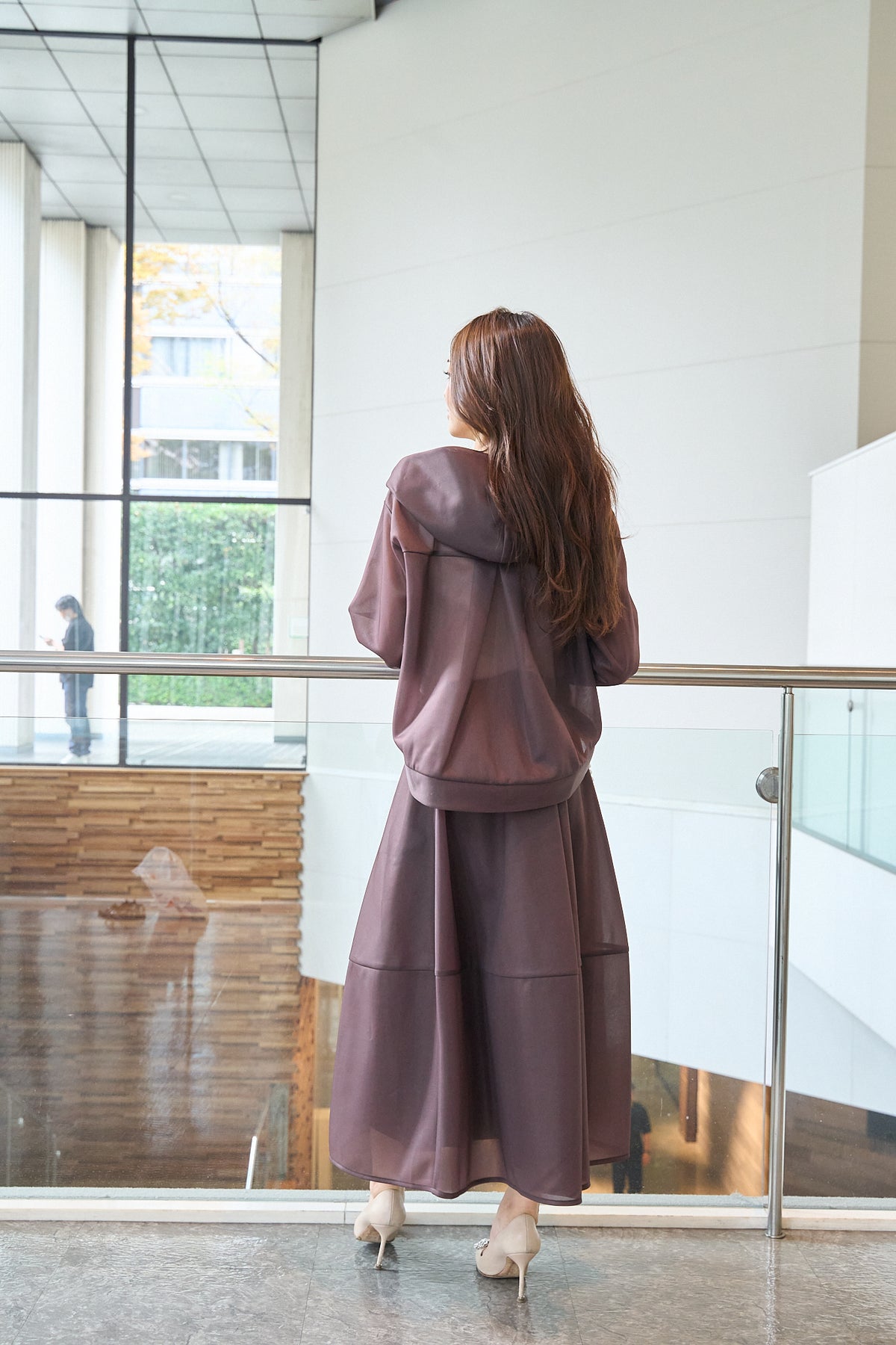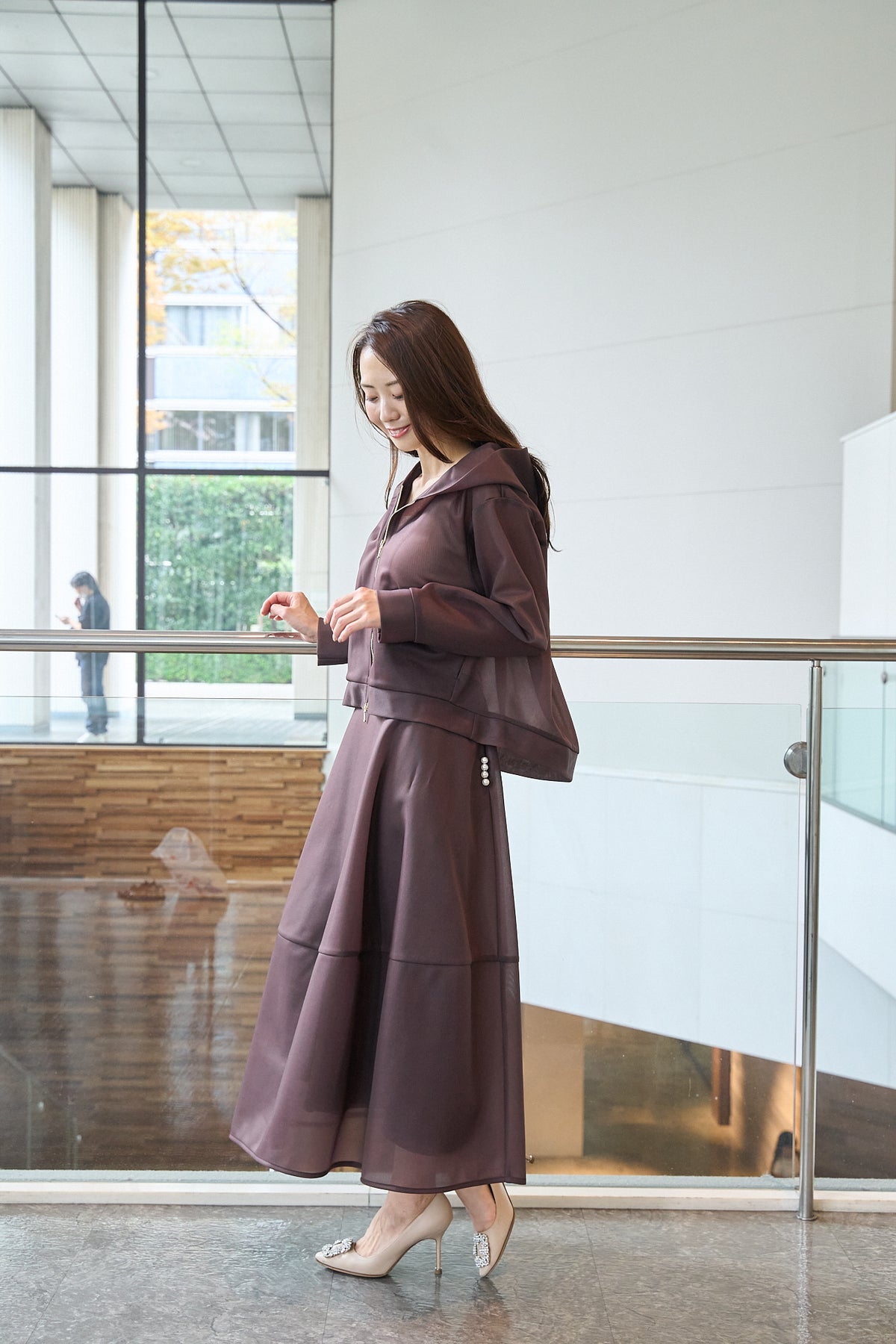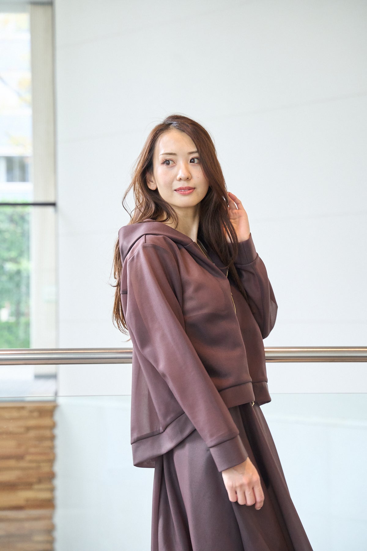 しっかりシアー素材と後見頃のパール飾りが特徴のブラウンパーカー