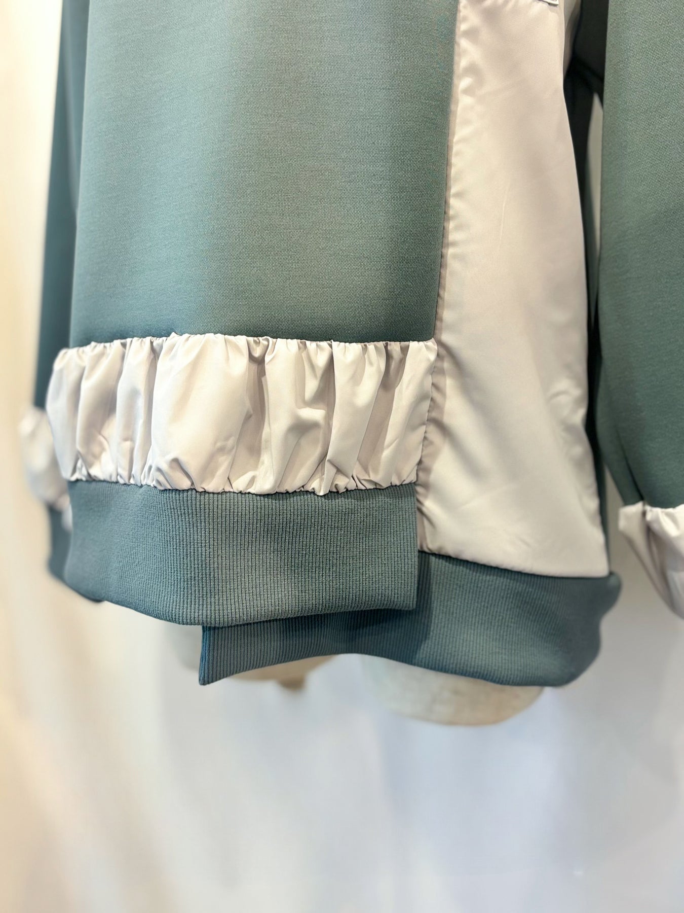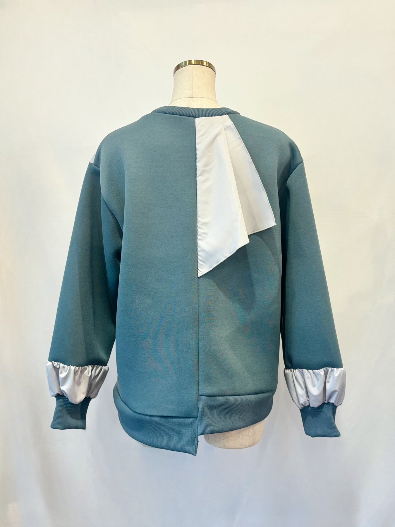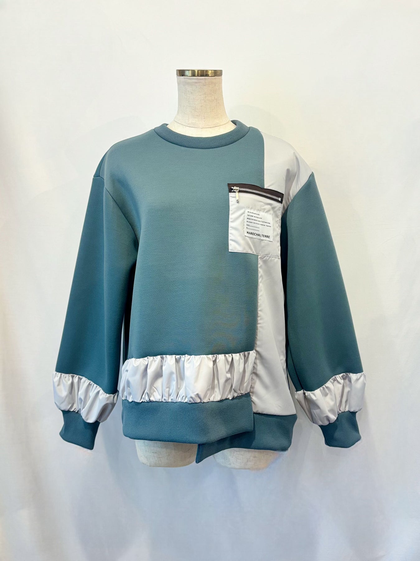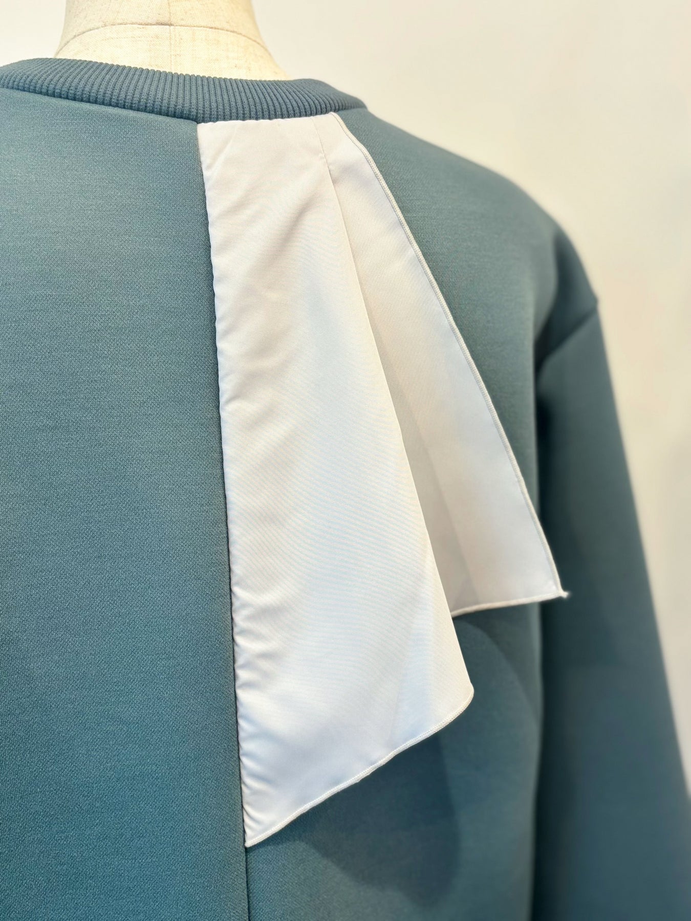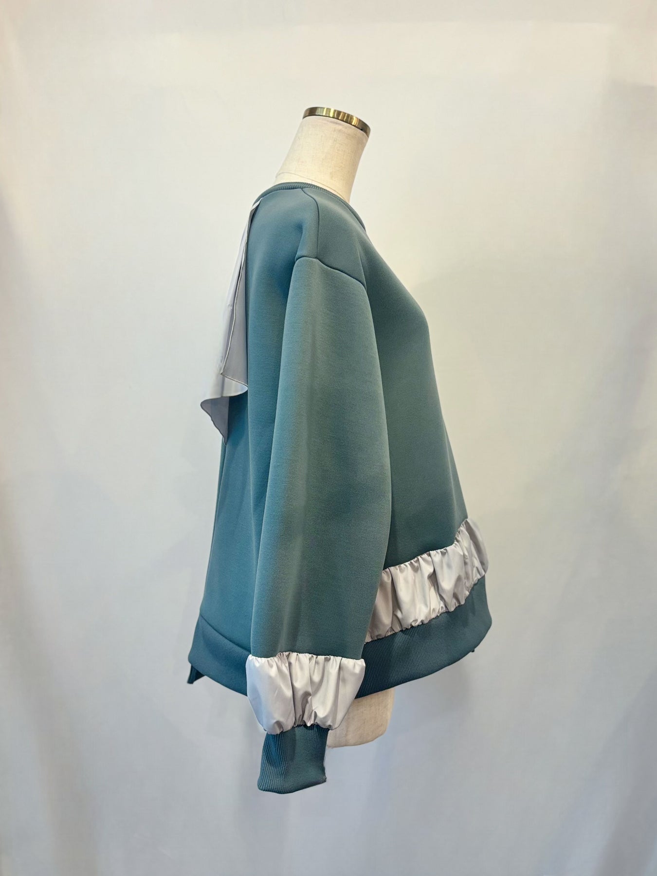 ポリエステルスパンを使用した軽量で崇高なダンボールニットに、異素材のギャザーディテールを大胆にドッキング。
