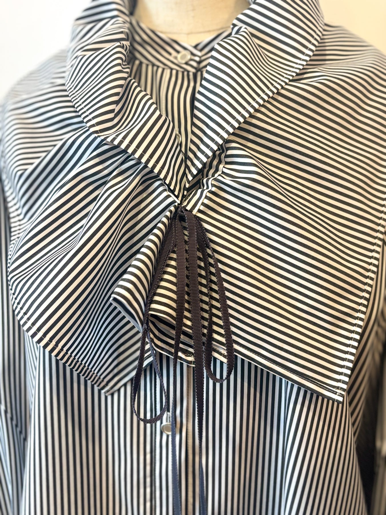 セットになった取り外し可能なフリル衿が華やかでアイコニックな印象に。ギャザーの寄せ方でフリルの分量は調節可能。