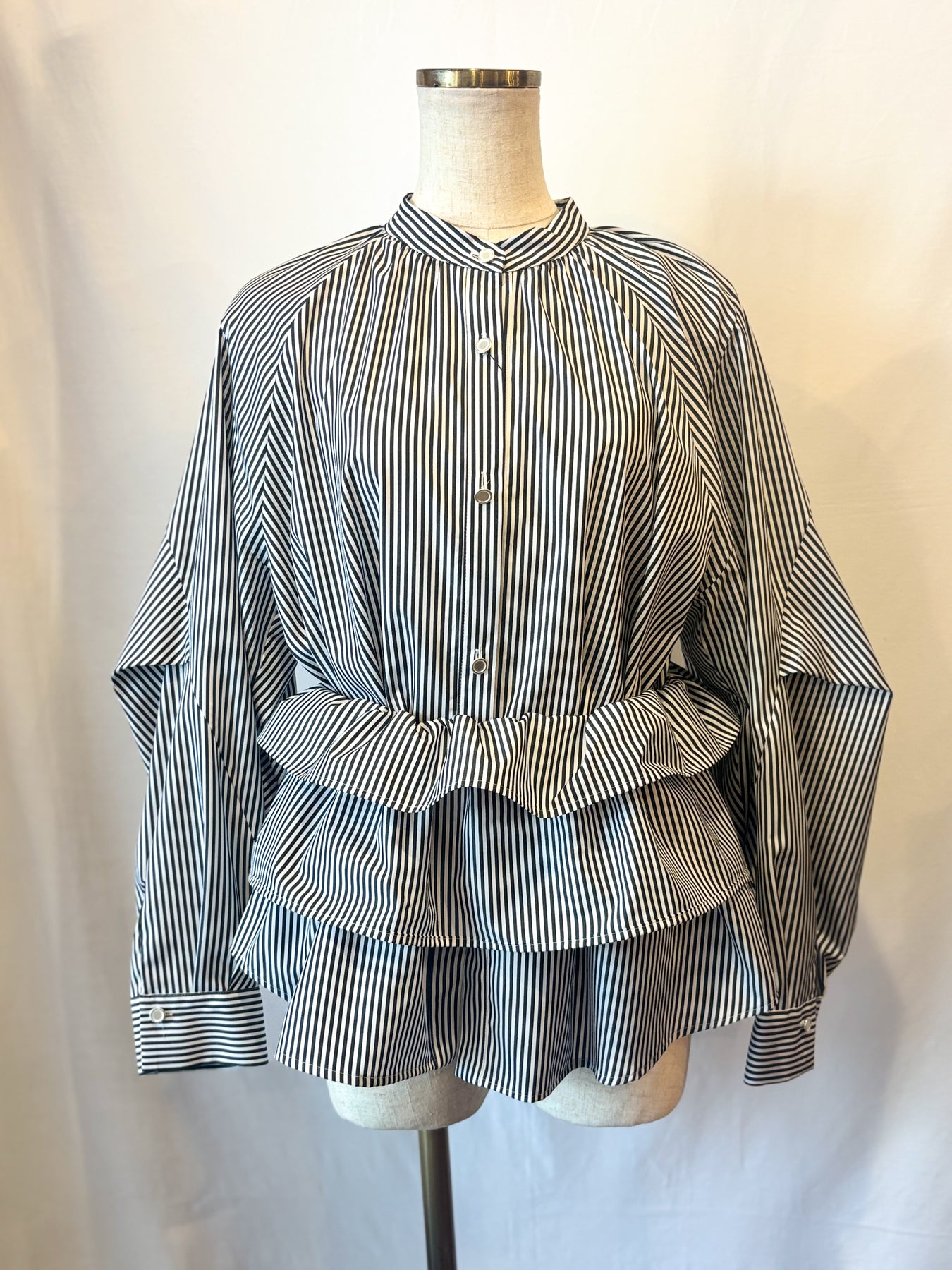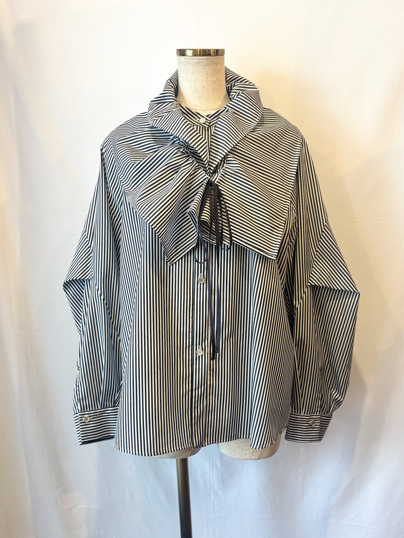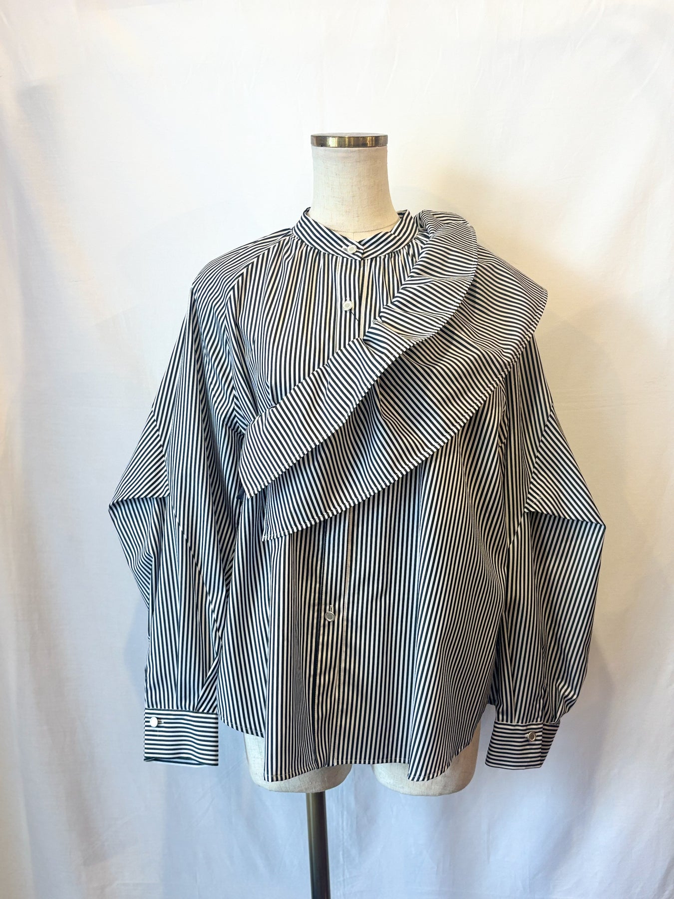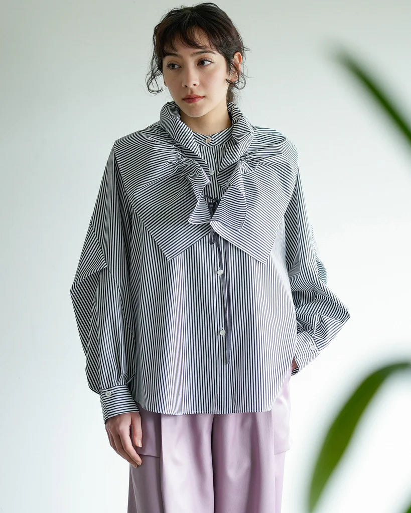 取り外し可能なフリル衿が華やかさを添えるシャツブラウス。